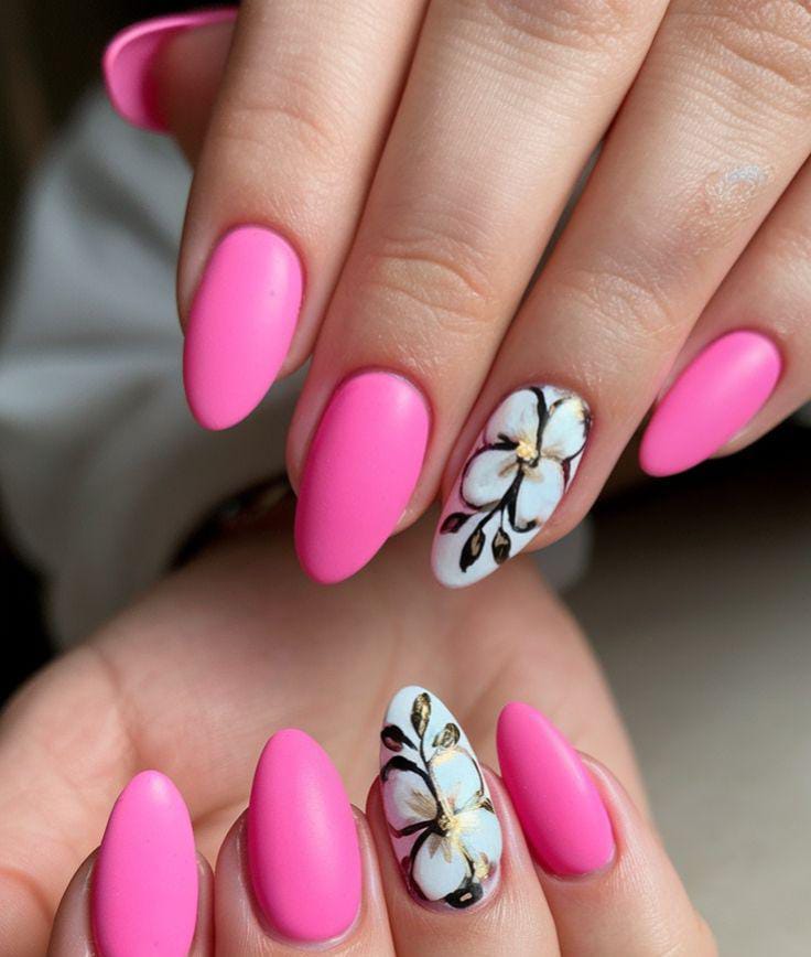 Vibrant pink nails are balanced with a white accent nail featuring a bold floral and gold detail design. This look is striking yet classy, perfect for making a summer statement while keeping it floral and soft.