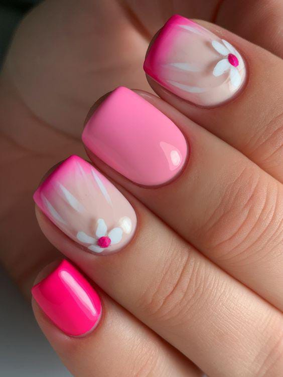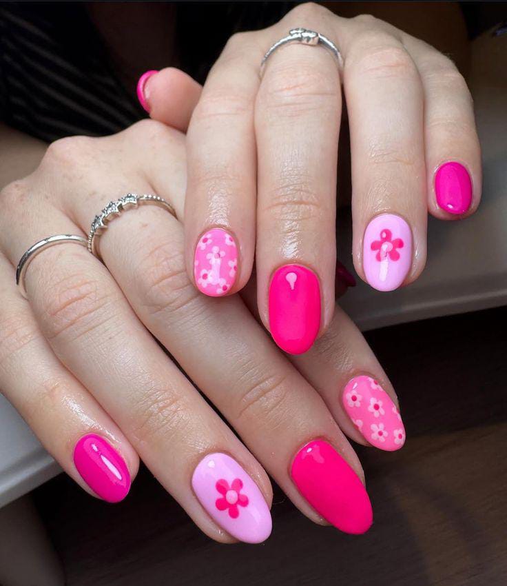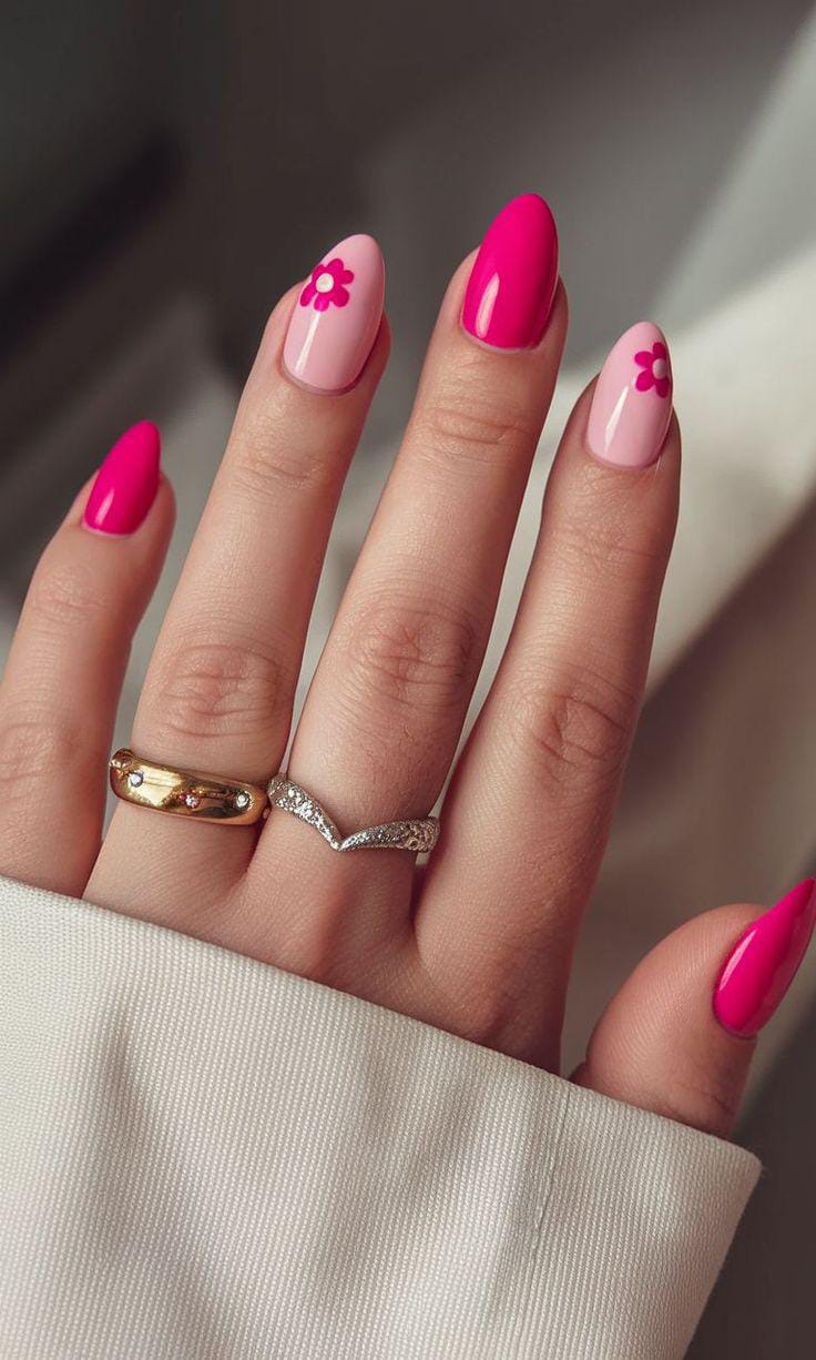 Soft blush pink and vibrant hot pink nails come together with simple flower accents. The design feels youthful, sunny, and effortlessly cute for everyday summer wear.