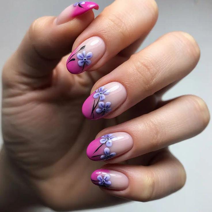This look blends a hot pink base with bold blue abstract floral shapes for a modern, artsy finish. The contrast feels energetic and youthful, perfect for a statement summer manicure.