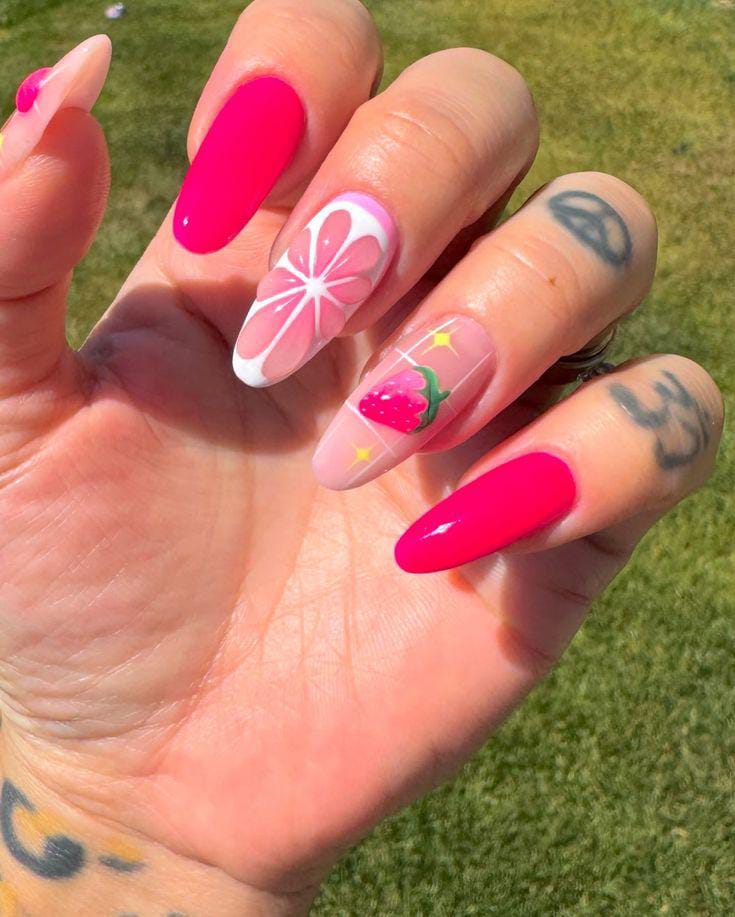 Bright pink nails are balanced with sheer accents featuring fruit-inspired details. The mix of glossy color and subtle art gives it a fresh, fun, and sunny summer vibe.