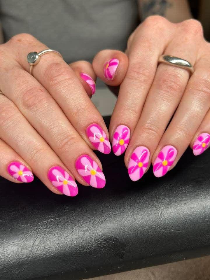 These nails combine a vibrant pink base with simple, graphic flower designs in lighter pink and yellow center. The look feels cheerful and fresh, with a cute, retro summer energy.