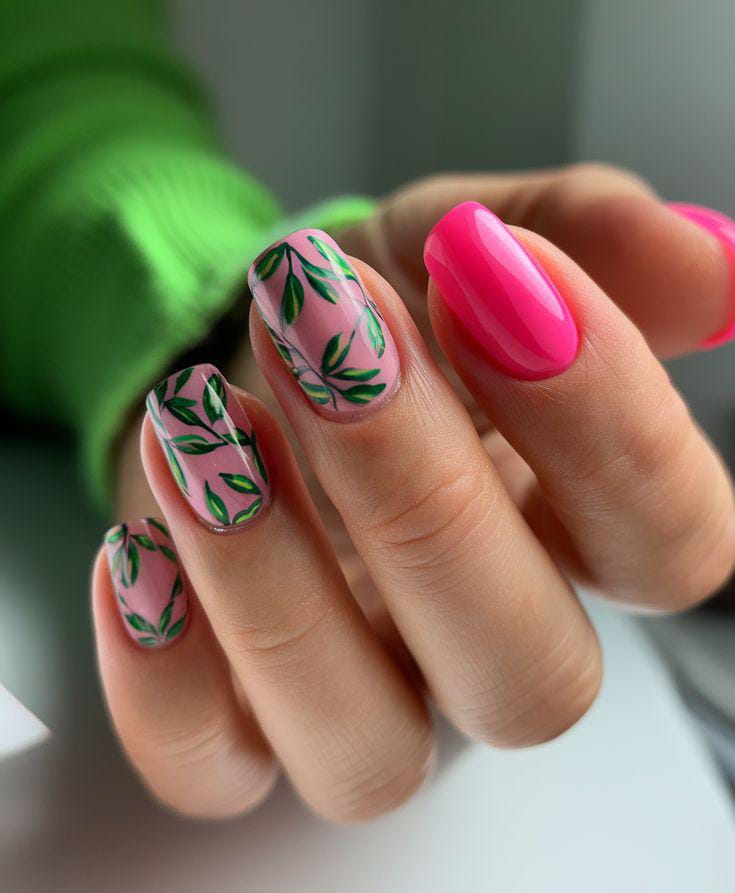 This look combines glossy pink nails with subtle nude accents and tiny floral, leaves details. The style is clean and modern, giving off a soft yet polished summer vibe.