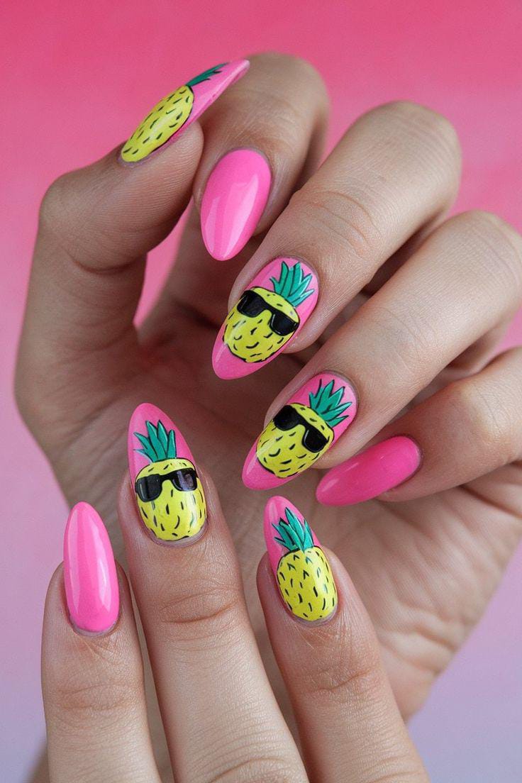 Bright pink nails are mixed with adorable pineapple illustrations, some even wearing sunglasses. This design is playful and tropical, bringing a fun, beachy summer mood.