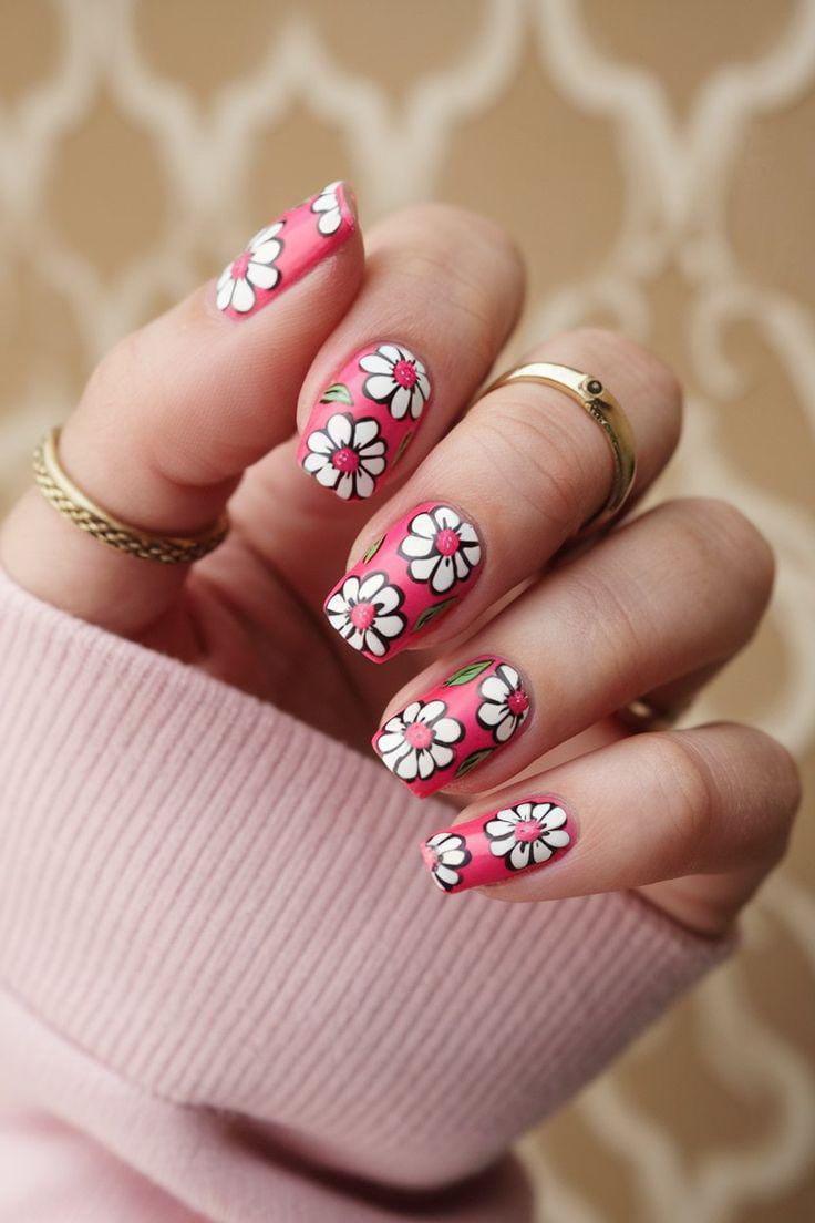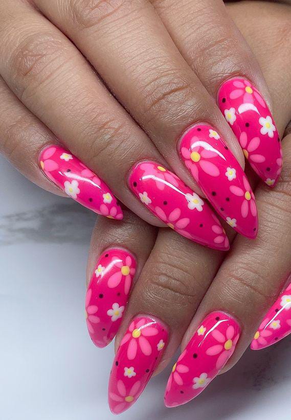 Bright pink nails are covered in cute daisy patterns with tiny dot accents that give a retro feel. The overall style is fun, cheerful, and perfect for a bold summer statement.