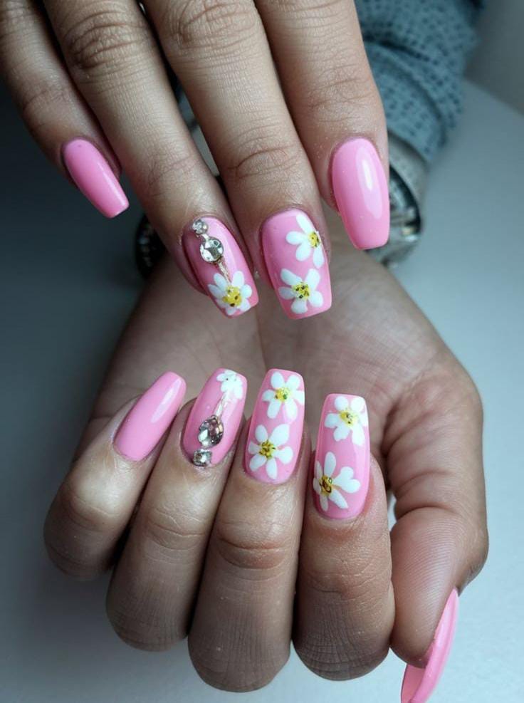 This set features a soft pink base with delicate white flowers and subtle rhinestone accents. The style is feminine and polished, blending sweetness with a touch of summer glam.