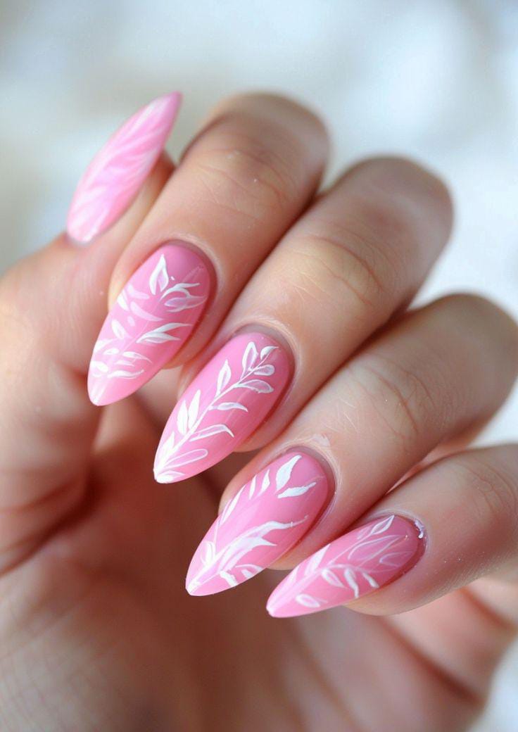 Light pink nails are enhanced with fine white leaf patterns that feel airy and graceful. The overall look is minimal yet elegant, perfect for a soft summer aesthetic.