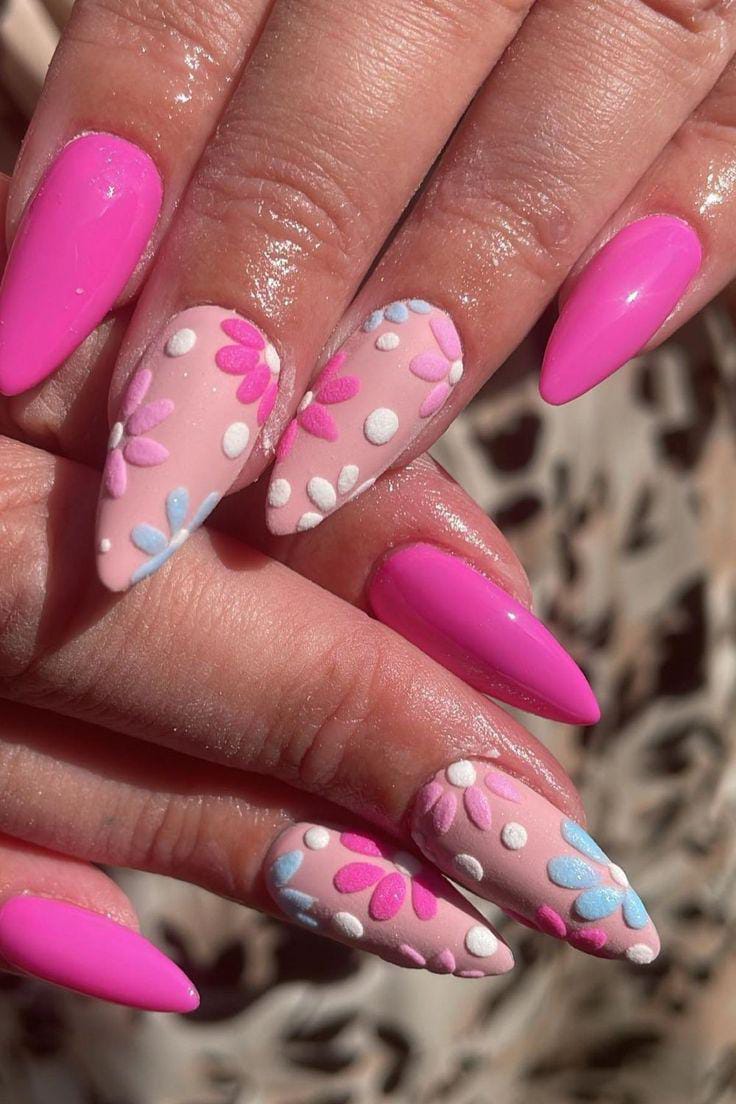 This design combines vibrant pink nails with pastel pink accent nails decorated in raised floral patterns. The matte-meets-gloss look adds a fun texture that feels modern and eye-catching summer aesthetic.