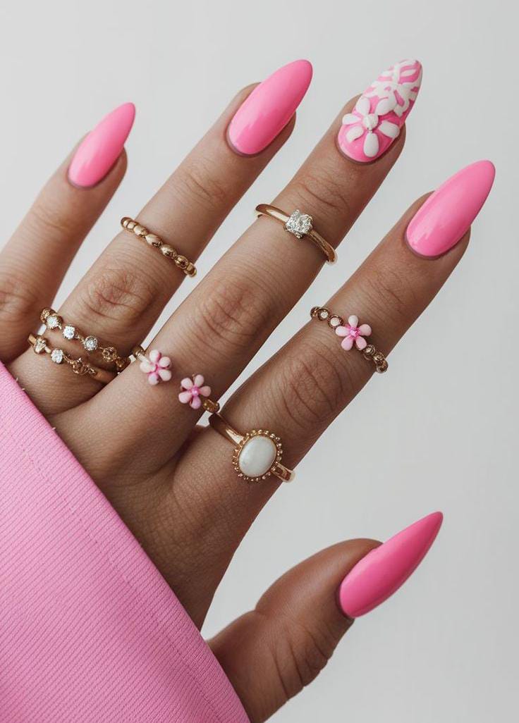 A bold pink base is paired with soft white accent nails featuring delicate floral designs. The look feels feminine and polished, balancing statement color with subtle, elegant summer details.
