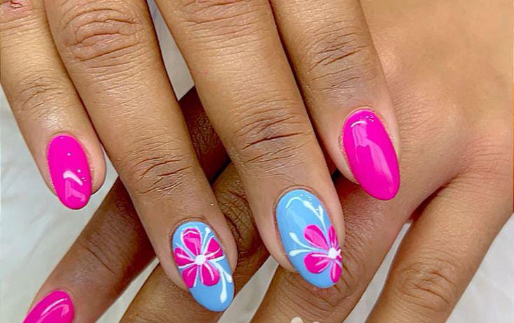 Hot pink nails are balanced with sky-blue accent nails featuring bold floral designs. The contrast creates a fun, energetic look that feels bold, creative, and full of summer color.