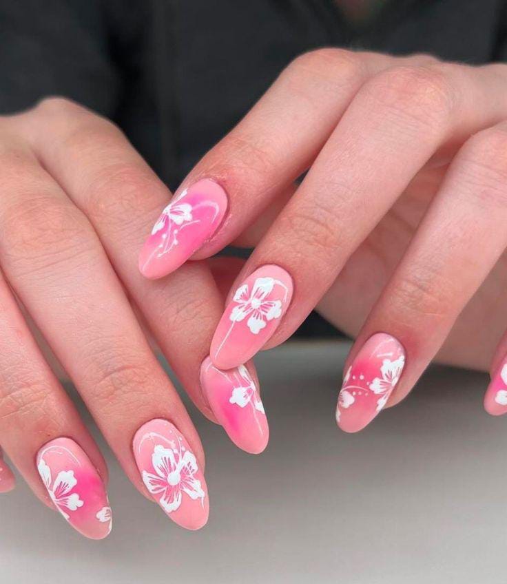 These nails feature a smooth pink gradient with white floral accents that feel light and airy. The overall vibe is sweet and romantic, perfect for a soft summer aesthetic.