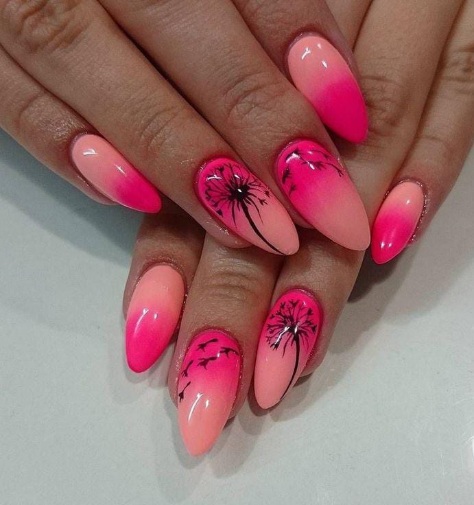 This look features a pink ombré fade that shifts from soft blush to vibrant pink, topped with black floral silhouettes. It has a tropical, sunset-inspired vibe that feels bold, fun, and perfect for summer vacations.