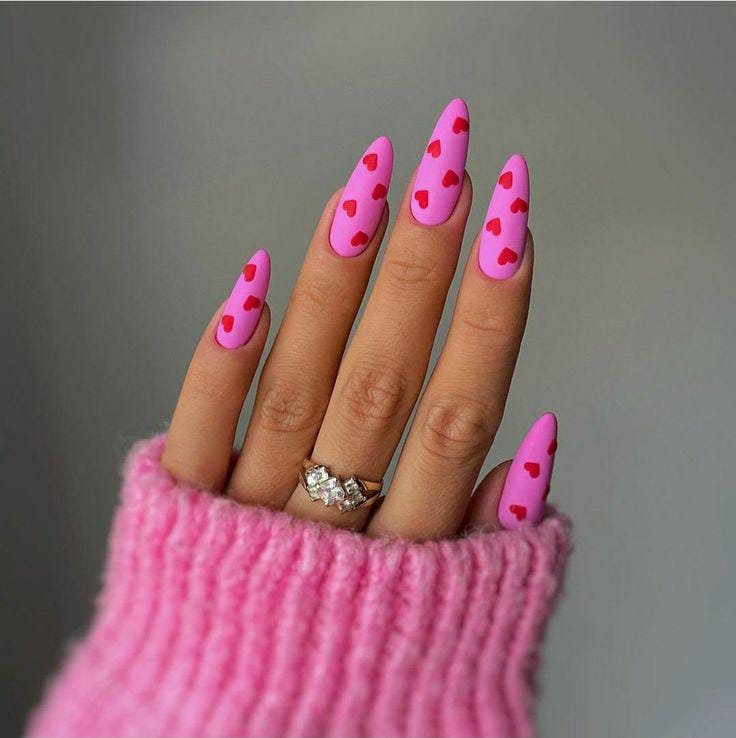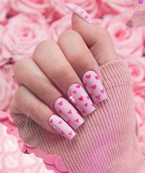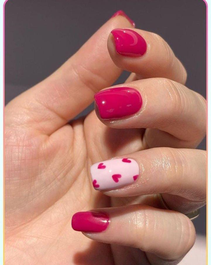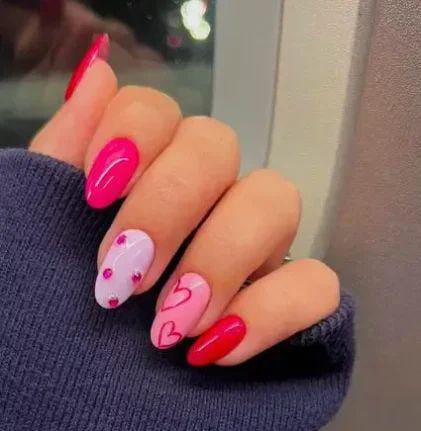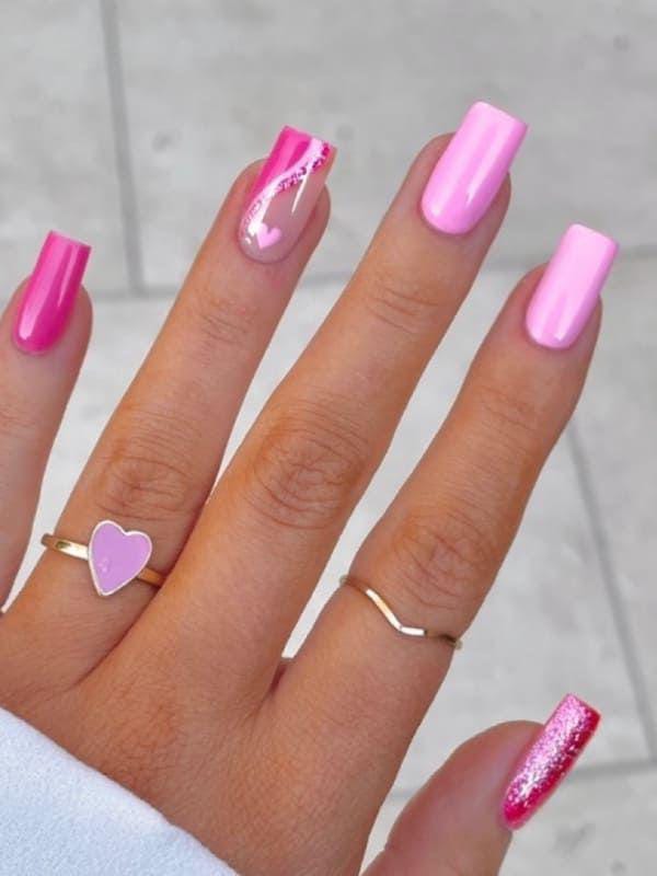 A blend of soft pink and bright pink nails paired with accent nails covered in scattered hearts. The mix of solids and patterns gives it a fresh, lively Valentine’s look.