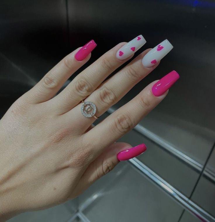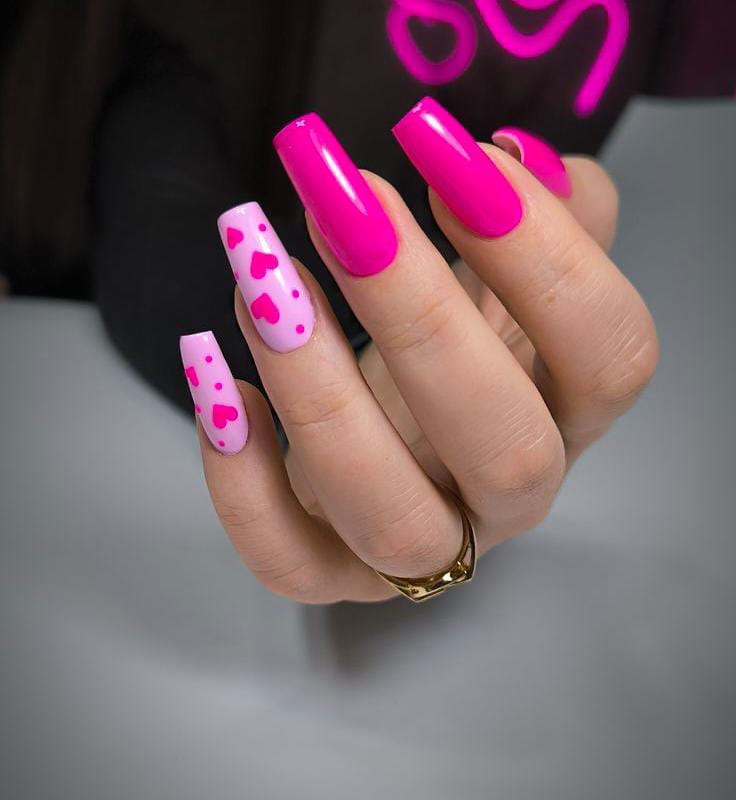 Vivid neon pink nails mixed with pale-pink accent nails covered in scattered heart shapes create a fun, modern Valentine’s style that really stands out.