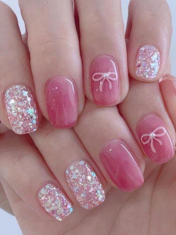 A soft rosy-pink manicure paired with chunky iridescent glitter accents, finished with tiny bow designs for a cute and delicate Valentine’s look.