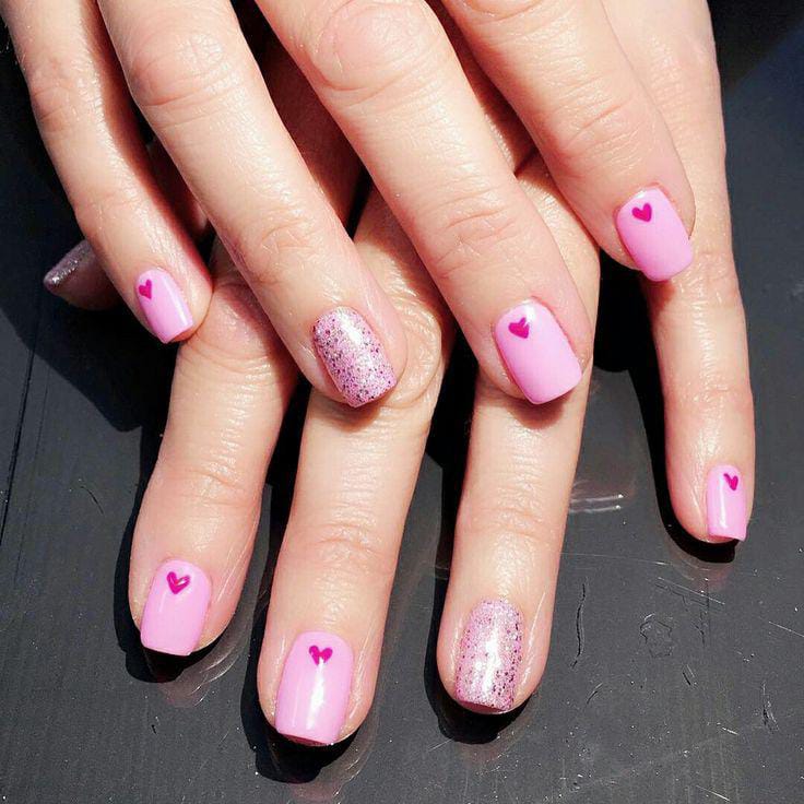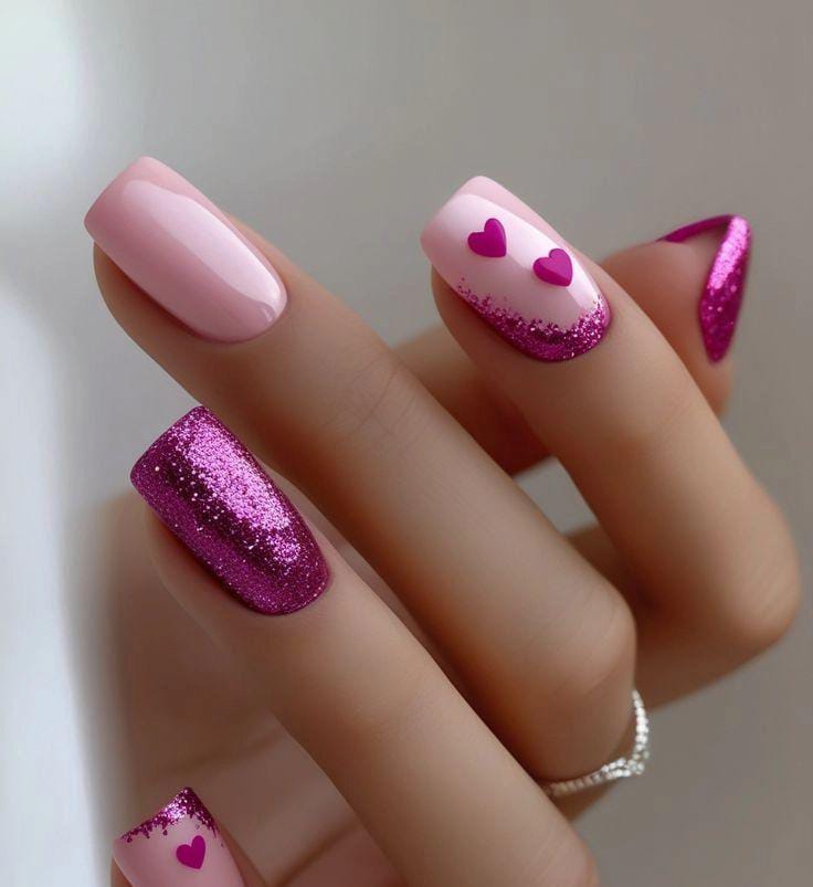 A mix of glossy blush pink and bold hot-pink glitter, highlighted with tiny heart accents that give the design a fun, flirty Valentine’s feel.
