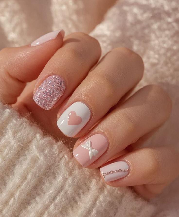 Soft pastel pink and white nails decorated with a glossy heart, a tiny 3D bow, and a sparkling glitter accent, creating a sweet and cozy Valentine aesthetic.