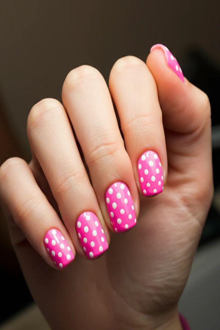 Bright bubblegum-pink nails covered in crisp white polka dots, giving the design a cute, youthful, and cheerful Valentine vibe.