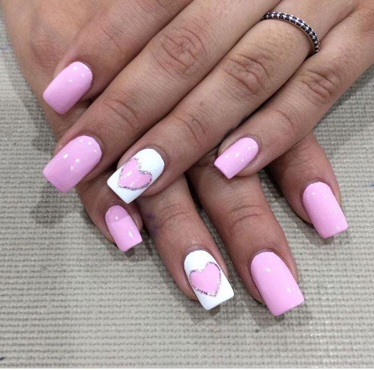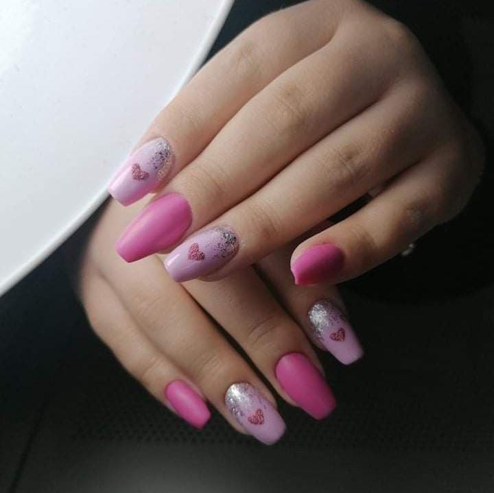 Matte and glossy pinks paired with silver glitter and tiny heart accents make this design look soft, dreamy, and perfectly Valentine-themed.