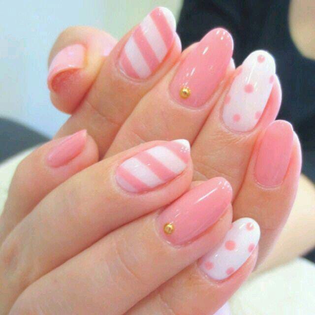 Soft pastel pink tones mix with white polka dots, stripes, and little gold studs for a very gentle, candy-like Valentine aesthetic. It’s a sweet, girly style that feels both soft and polished.