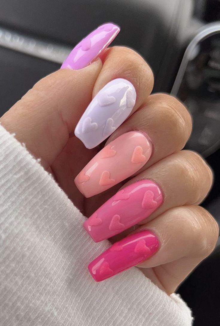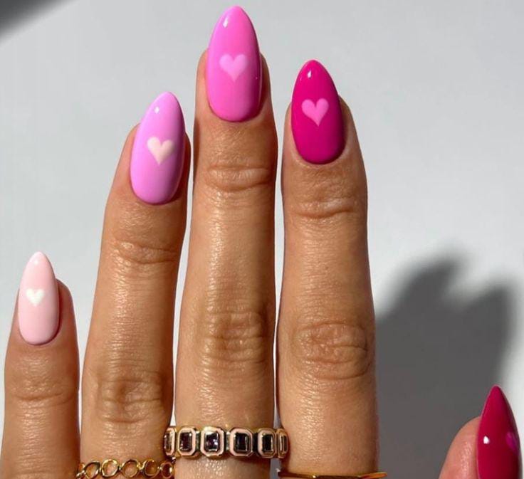 An ombré-style mix of light pink, bubblegum pink, and fuchsia nails, each topped with a small contrasting heart. The sleek, glossy finish gives the whole set a bright, modern Valentine’s feel.