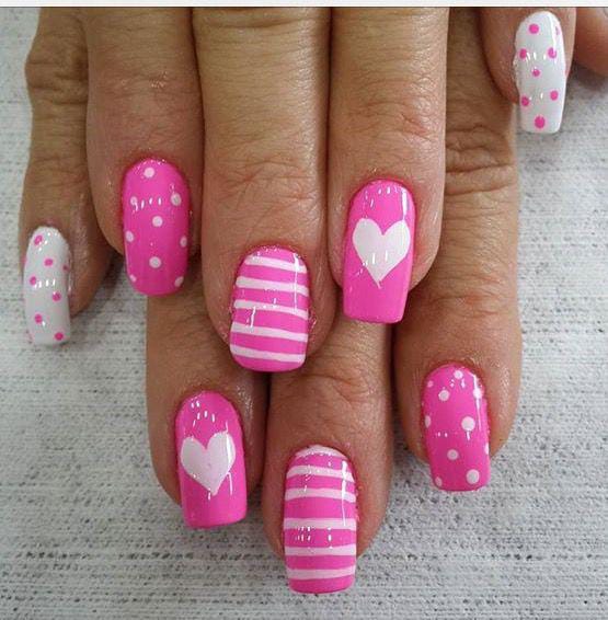 A vibrant hot-pink base paired with white hearts, dots, and striped accents creates a bold and lively Valentine’s look. The high-contrast patterns make it eye-catching yet playful.