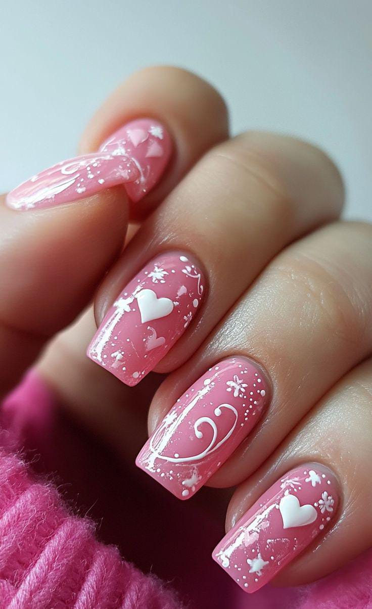 A mix of vibrant pink polish, glittery textured nails, and white accent nails filled with cartoon-style hearts creates a fun, playful Valentine’s vibe.