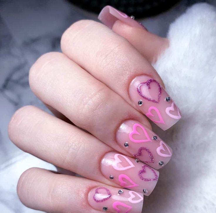 A mix of bright pink and soft pastel nails, featuring cute heart outlines and tiny rhinestones for a sweet, romantic Valentine’s vibe.