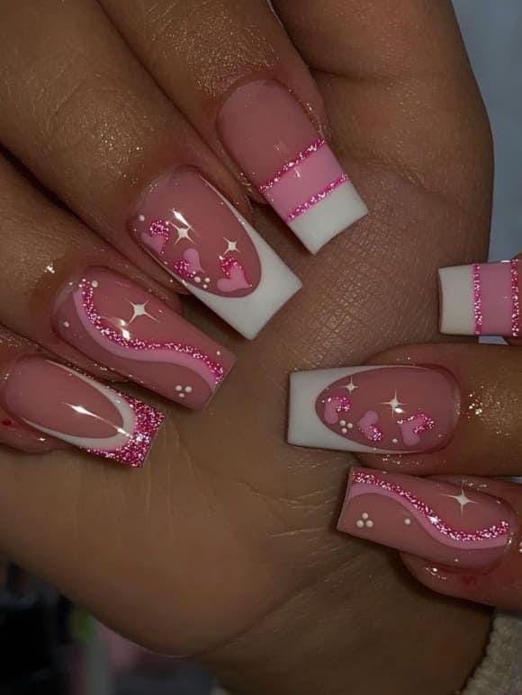 A blend of pink-and-white French tips and glittery pink swirls creates a bold, glossy look that feels both romantic and modern Valentine.