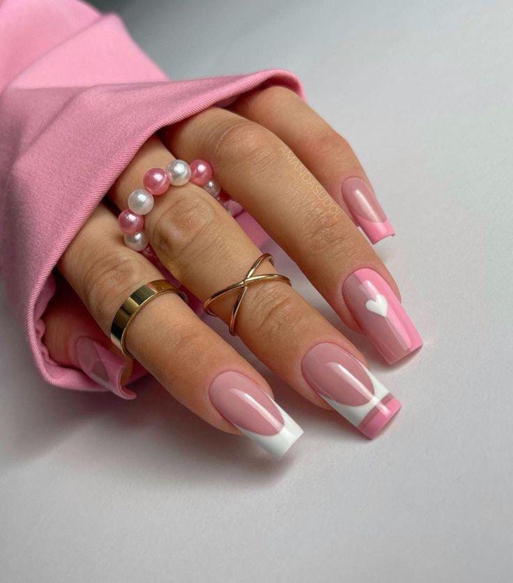 A sleek pink-and-white French style with clean lines and a single white heart detail gives this set a classy, minimal, and elegant Valentine’s look.