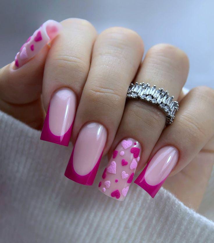 Bright pink French tips mixed with an accent nail full of textured heart shapes create a fun, bold, and eye-catching Valentine’s design.