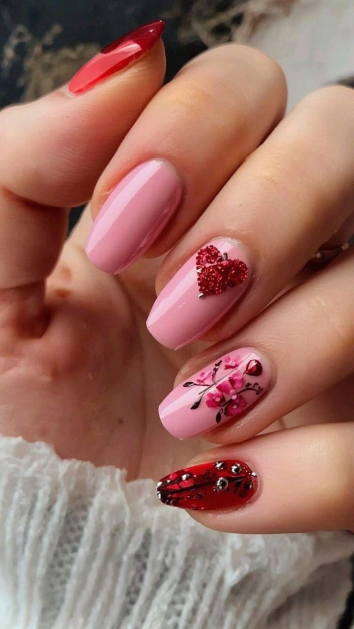 Soft pink nails paired with red accents and delicate floral art create a dreamy, romantic Valentine look with a mix of shimmer, hearts, and tiny blossoms.