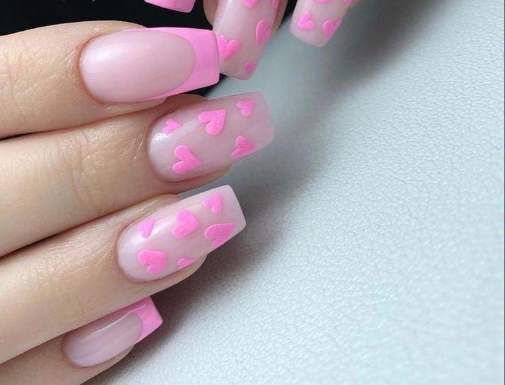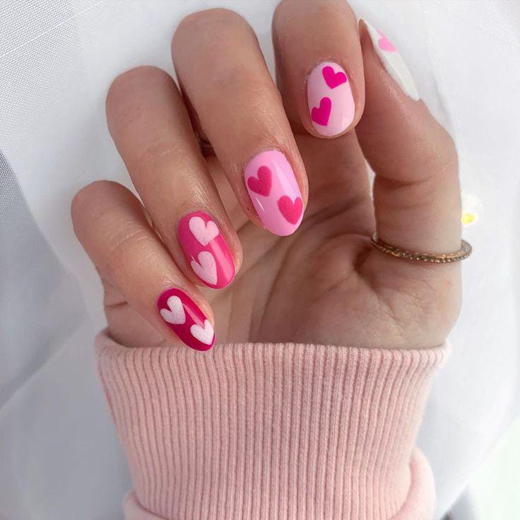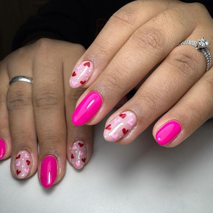 Bright hot-pink nails mix with sheer pink bases decorated in scattered red and light-pink hearts for a playful, sweet Valentine vibe.