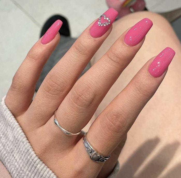 A classic shiny pink manicure gets a touch of sparkle with a rhinestone heart on the ring finger. The look is chic, bright, and subtly glam Valentine.