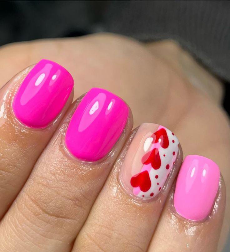 This design features vibrant hot-pink nails paired with an accent nail decorated in red hearts and tiny dots, giving it a playful and sweet Valentine’s vibe.