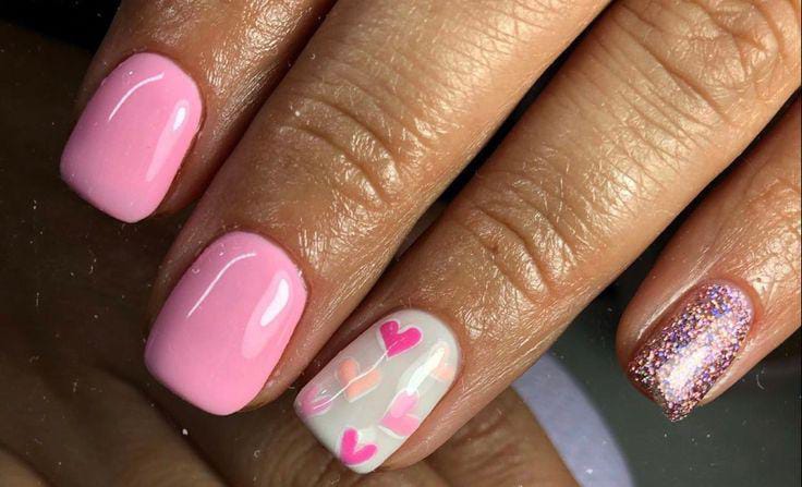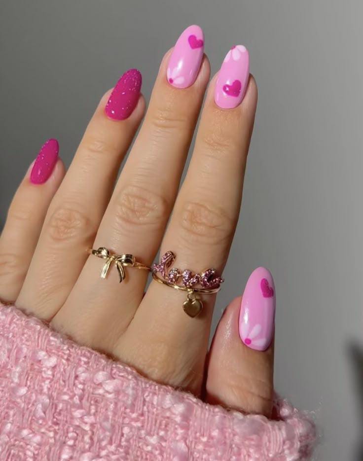 A blend of glossy light-pink nails with tiny heart accents, sparkly magenta nails, and soft floral touches creates a cute, romantic Valentine look with a cozy feel.