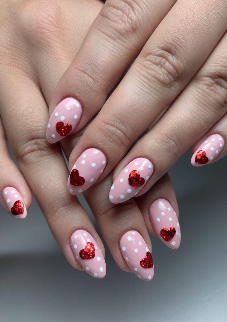 Soft pink nails decorated with white polka dots and bold red glitter hearts create a playful yet romantic Valentine’s look with a touch of sparkle.