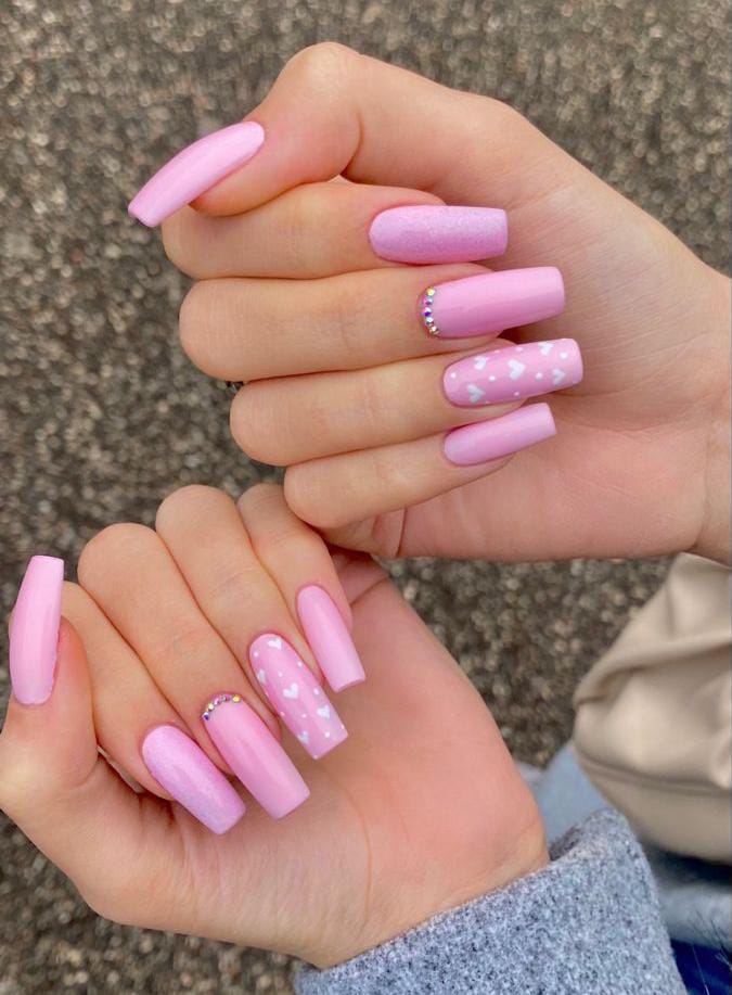 A set of long pastel-pink nails mixes matte, glossy, and sparkly finishes, complemented by tiny white hearts and a hint of rhinestone detail. It’s a soft, feminine, and cute Valentine without being overdone.