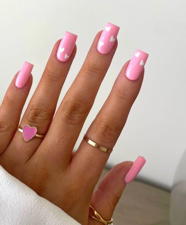 Simple baby-pink nails topped with small white hearts offer a clean, minimal, and dreamy Valentine’s Day look.