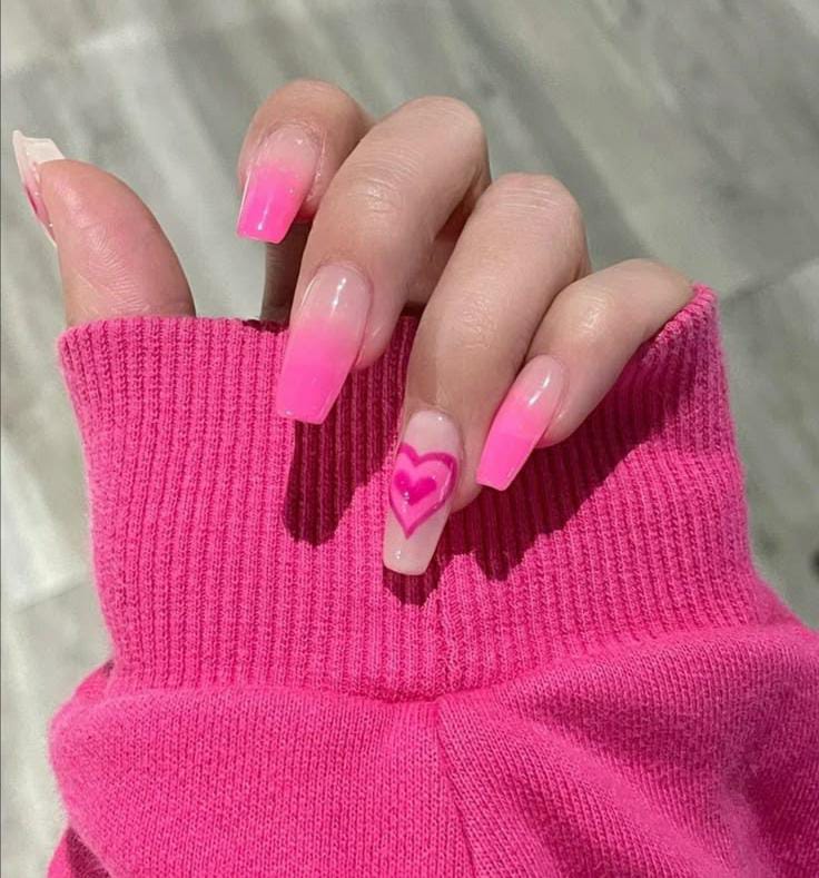 This design features long square nails with a smooth pink ombre and a single accent nail decorated with a bold double-outlined heart, giving it a soft but playful Valentine’s vibe.