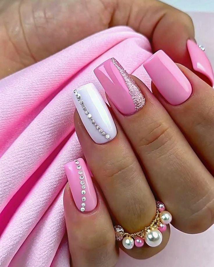This design combines pastel pink and white nails decorated with tiny rhinestone lines and a glittery accent nail, giving it a classy, glamorous Valentine’s look.