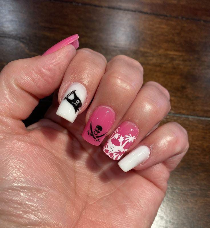 Pink and white nails decorated with skulls, crossbones, and palm trees for a playful island-pirate feel.