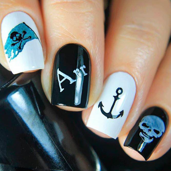 Bold black and white nails with anchors, skulls, and pirate lettering for a sharp, nautical look.