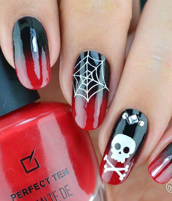 Red-to-black ombré nails featuring spiderwebs and skulls for a dramatic, edgy pirate twist.