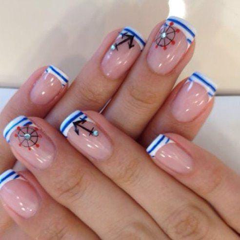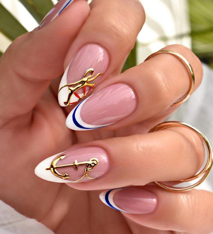 Elegant nude and white tips with sharp blue accents, finished with metallic gold anchors and a shipwheel for a chic maritime style.
