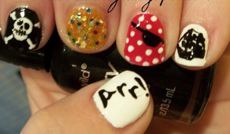 Fun mix of glitter, skulls, polka dots, an eyepatch and “Arr!” lettering for a quirky, adventurous pirate look.