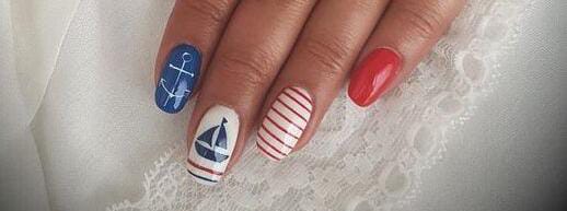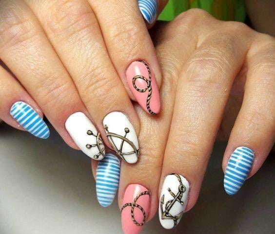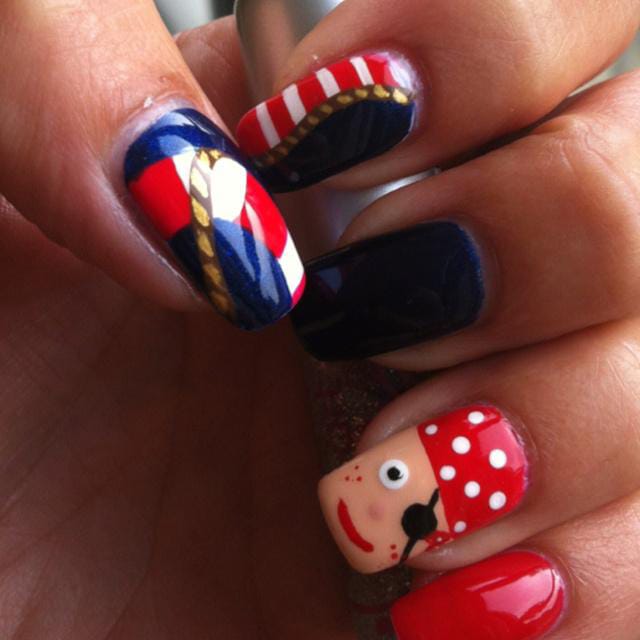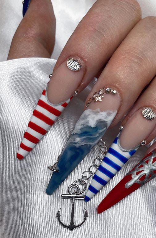 Bold red, blue, and striped french tips combined with crashing wave art and a dangling anchor charm make these nails dramatic and pirate’s adventurous vibe.