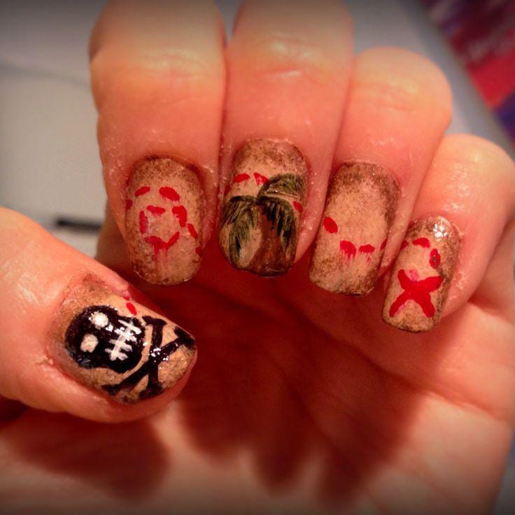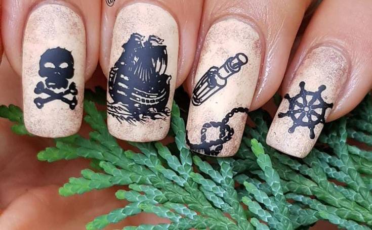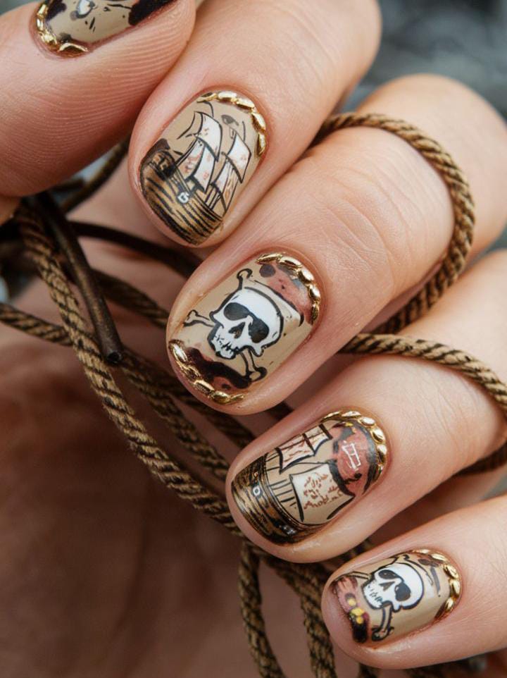 Sandy textures and classic skull-and-crossbones, ships and shipwheel details give these nails a rugged, treasure-hunting vibe.