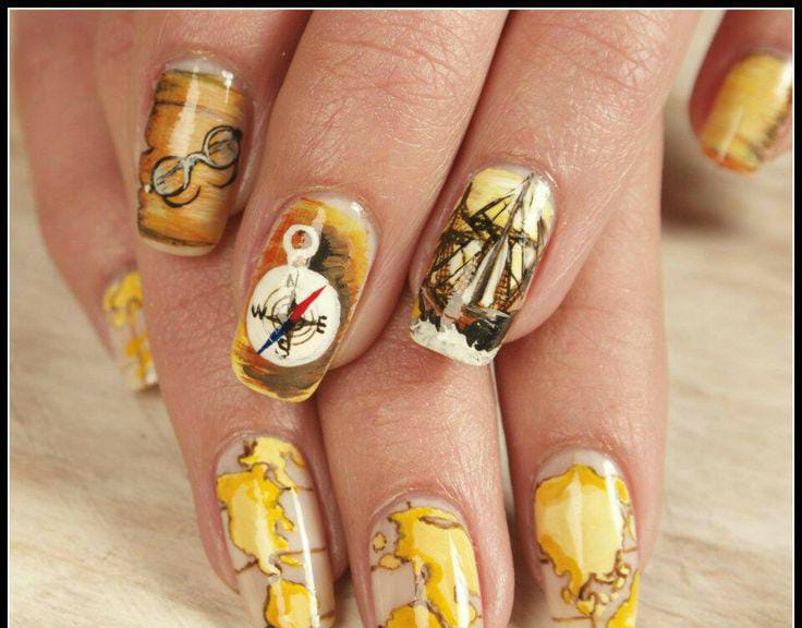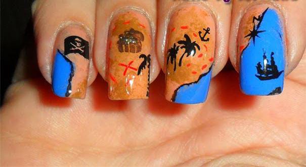Bold map-style nails with ocean blue edges, pirate ships, treasure chests, and palm trees.