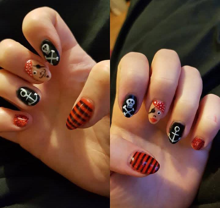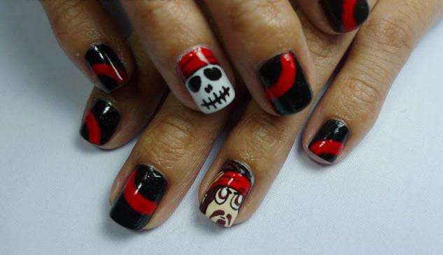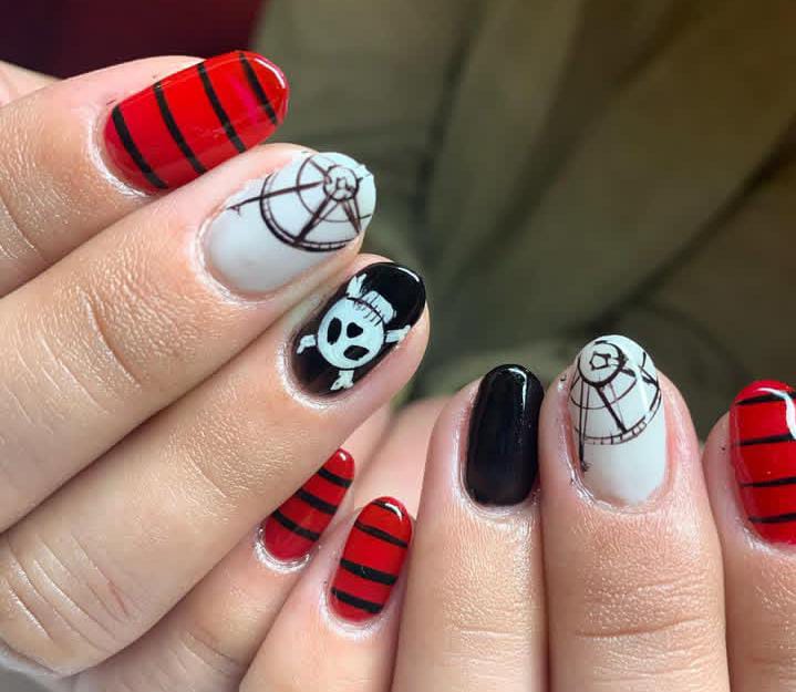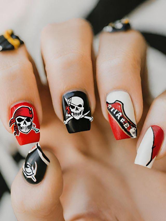 A bold black base with red swirls and accent nails featuring a pirate skull and face, giving a playful yet edgy pirate look.