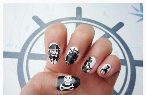 Monochrome nails with detailed pirate art, ships, and skulls, creating a dramatic and adventurous vibe.